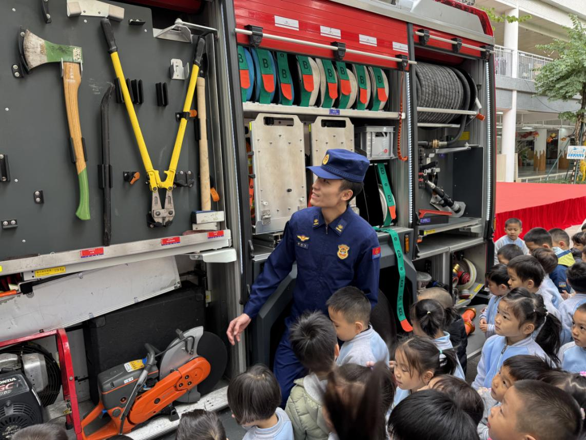 演练结束后,消防员带领孩子们近距离观察消防车,讲解车上装备的功能,例如云梯可升至高处救援被困人员、水枪能喷射水流灭火。面对孩子们的好奇提问,消防员逐一耐心解答,还允许孩子们触摸消防头盔,直观感受消防装备的特点。