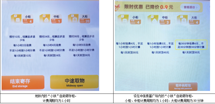 而大柜像小柜一样实施的“1小时的计费周期”,则不会像“小铁”品牌设在中信泰富广场内的寄存柜那样改为30分钟计费周期。这是因为“小铁”品牌在其他商务楼里的寄存柜,大柜为“每30分钟收费6元”“每1天封顶50元”,“该定价明显高于了现上海地铁定价,故不建议对现有定价调整,维持原价格。”
